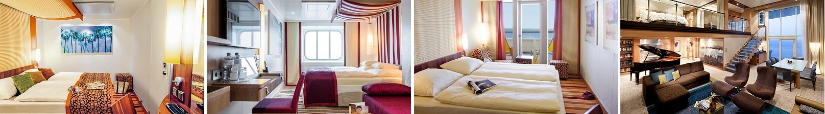 - Suite jsou největší a vybavením nejpohodlnější apartmány, často s oddělenou obývací a ložnicovou částí; vztahují se k nim také další výhody jako například komorník, vířivka, velká terasa s lehátky pouze pro vás, vstup do wellness, stravování v exkluzivní restauraci, přednostní nalodění a vylodění.