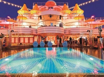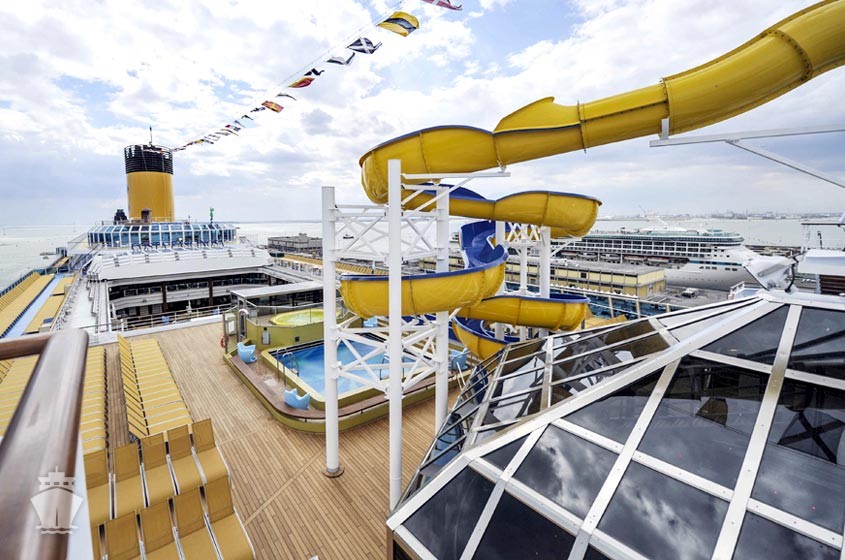 - otevřený bazén na horní palubě, 1 bazén s posuvnou prosklenou střechou, bazén pro děti s vodním miniparkem
