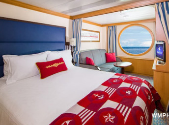 Zařízení kajut: dvoulůžková queen postel (matrace Posturepedic Sealy, ložní prádlo z egyptské bavlny), skříň, koupelna se sprchou, vanou a WC, vysoušeč vlasů, kosmetika H20 + spa (šampon, kondicionér a tělové máslo), obývací část se sofa a stolkem, oddělitelná závěsem, 22 palcová plochá Tv, bezpečnostní schránka, telefon s přímou linkou, zrcadlo, regulovatelná klimatizace.