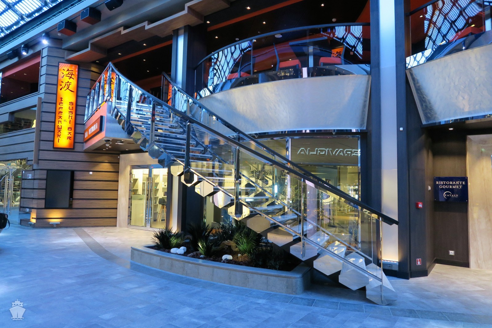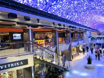 - centrální promenádní galerie s obchody a butiky, zaklenutá obří LED obrazovkou