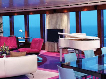 Suite: luxusní varianta ubytování na nejlepších místech na lodi, prostorné a luxusně vybavené; více variant včetně suite v privátní zóně The Haven