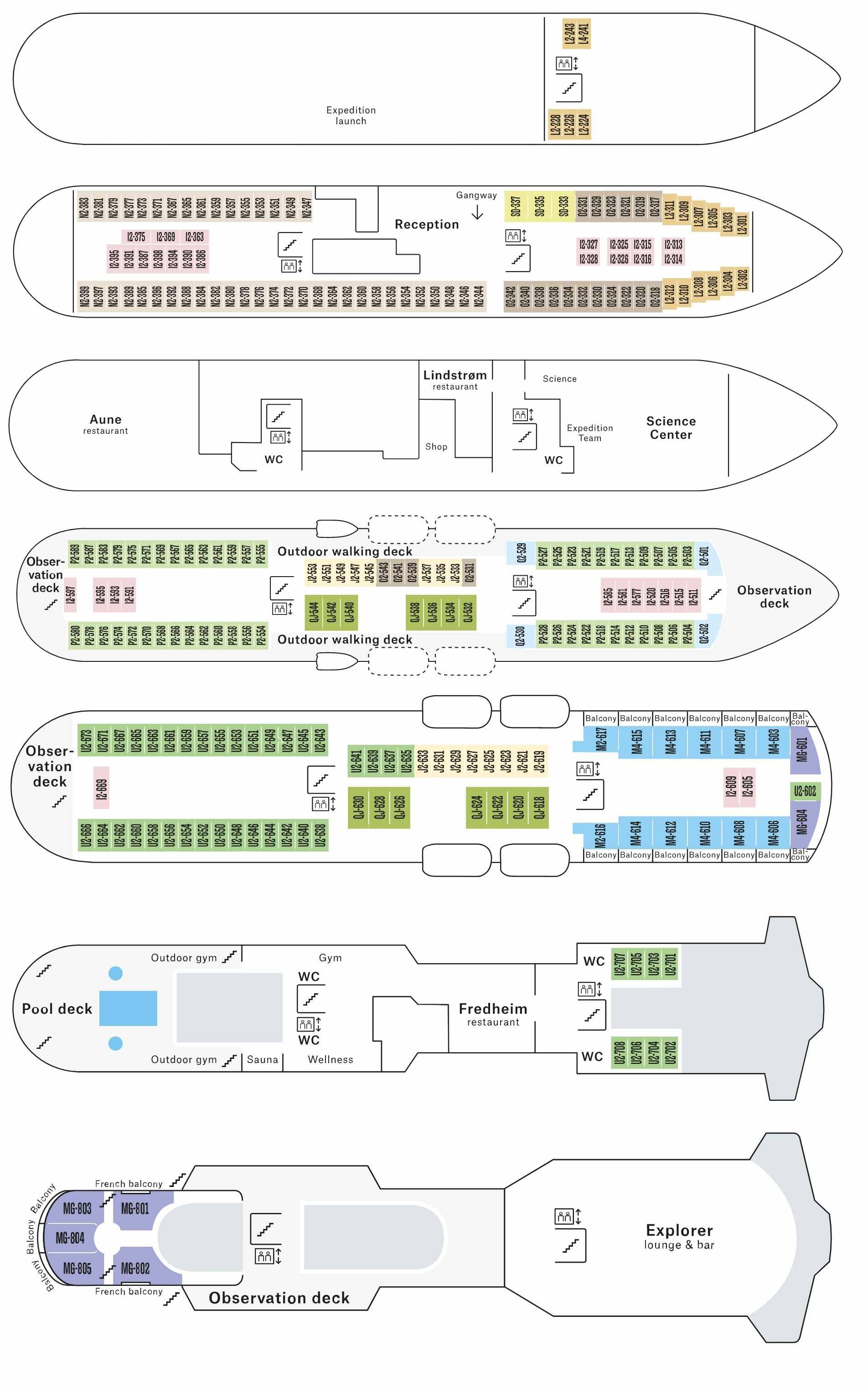 - Expedition Grand Suite MG: 25 - 29 m². Jedno nebo dvoupokojové apartmá na 6. a 8. palube, kapacita max 2 osoby, s TV a plným nebo francouzským balkonem.