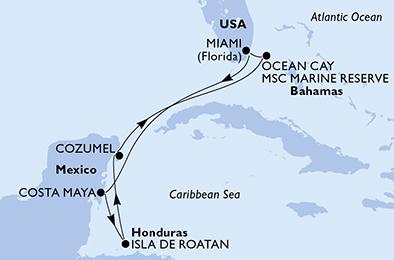 Během své zahajovací sezóny bude loď MSC World America exkluzivně plout po týdenních okruzích Karibikem a umožní svým hostům navštívit některé z nejvyhledávanějších destinací určené pro zvídavé cestovatele. Trasy lodi jsou navrženy tak, aby maximalizovaly čas, který mají hosté k dispozici během kotvení. Všechny okruhy budou zahrnovat návštěvy mořské rezervace Ocean Cay MSC Marine Reserve – úžasného soukromého ostrova MSC Cruises na Bahamách.