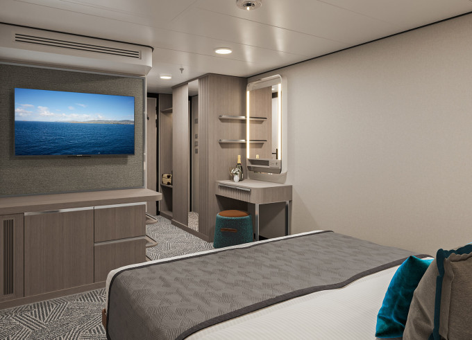 koupelna se sprchou a WC, 2 lůžka, v některých kajutách možnost přistýlek, toaletní stolek, úložné prostory, interaktivní TV, sejf, telefon, vysoušeč vlasů.