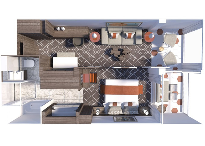 | EV - Edge Villa s balkonem 69 m² + terasa s vířivkou 20 m². 2podlažní apartmán. Max 4 osoby. 15/16. paluba. Výhody Suite. | 1 117 194 Kč 279 298 Kč za osobu |