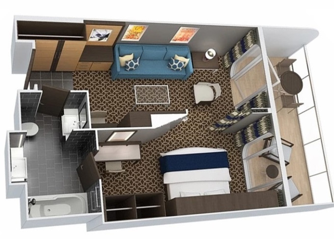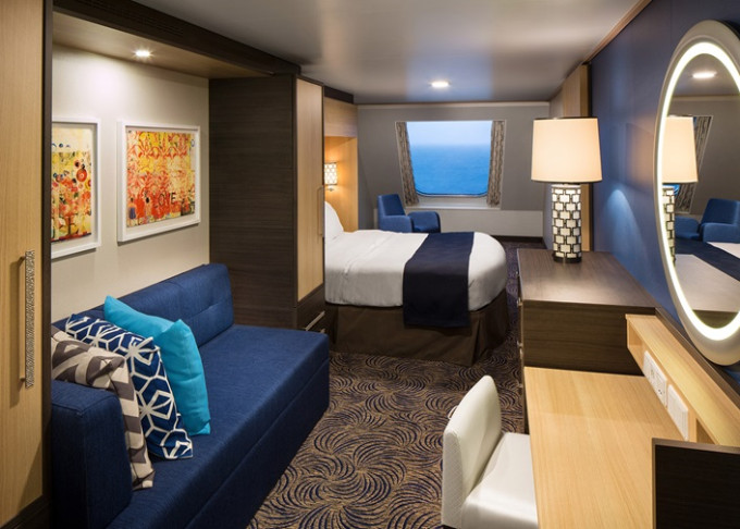 | 2U - Vnitřní kajuta s virtuálním balkonem 15 m². Obrazovka velkosti balkonových dverí s promítaným výhledem. 3/7. až 13. paluba. Max 2 osoby. | 30 622 Kč 15 311 Kč za osobu | ||