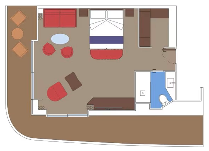 Vztahuje je se k typům a kategoriím kajut: s balkónem BA a apartmány Suites SD, SXJ, SXT, SX, SLJ, SLW, SLT, SLP, SLS, SL2, SL1, SRS, SRP, SR2, SR1, SM, VLA