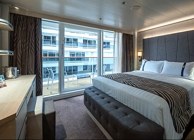 Kajuta s balkónem: 16 - 17 m², kajuta s manželskou postelí (na požádání 2 oddělené postele) a rozkládací pohovka. Klimatizace, koupelna se sprchou nebo vanou a WC, toaletní stolek, prostorná skříň, interaktivní TV, telefon, sejf, vysoušeč vlasů, virtuální asistentka ZOE. Balkony se stolkem a židlemi. Některé kajuty mají omezený výhled; kajuty PR1, PR2, PR3, PV mají výhled na promenádu.