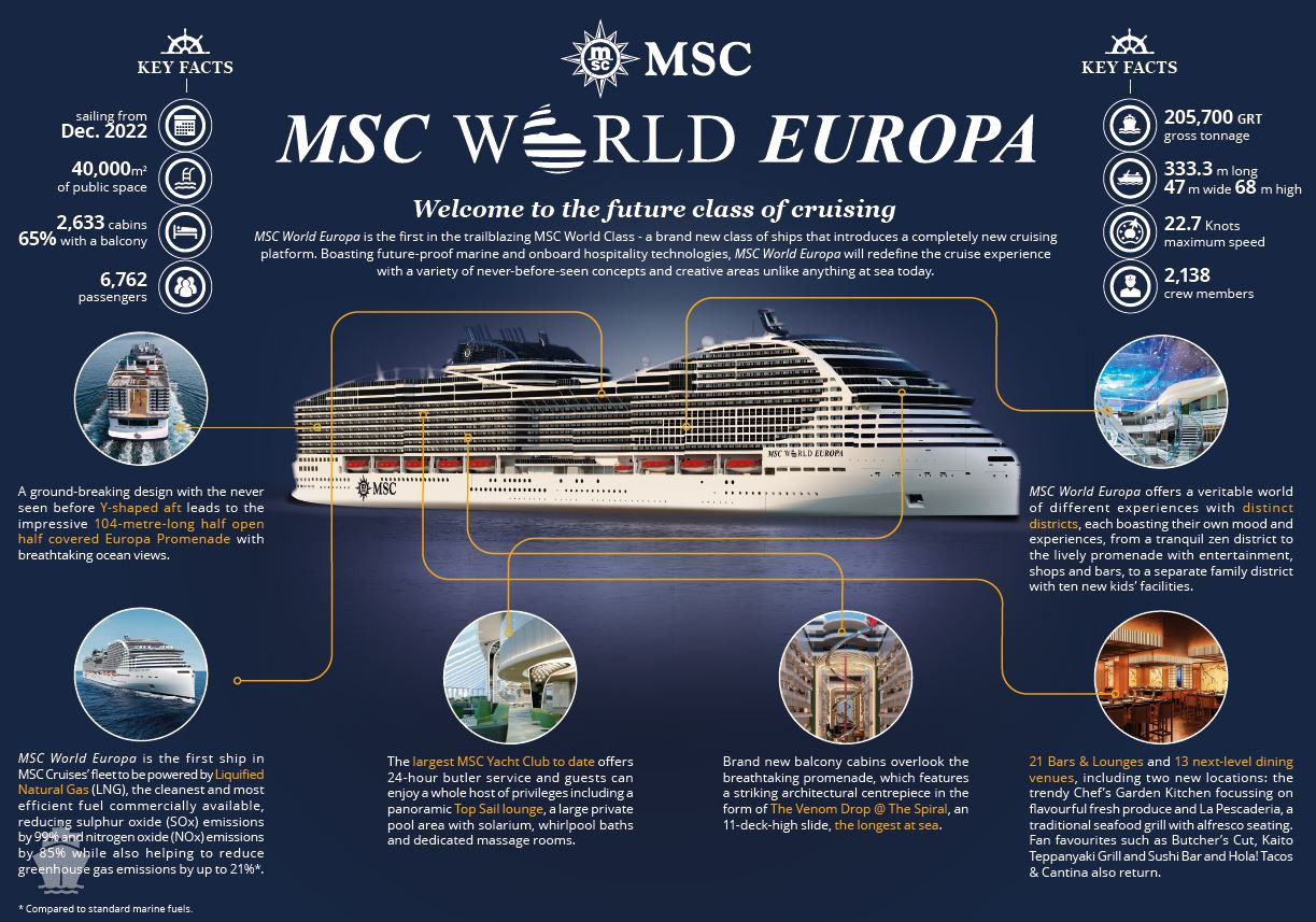 Průlomový design lodě MSC World Europa je založen na nové originální platformě. S nápadnou futuristickou siluetou ve tvaru šípu snadno prořezávajícího vlny, vertikální 90-stupňový úhel čela lodi má za účel zlepšení stability a hydrodynamiky lodě.