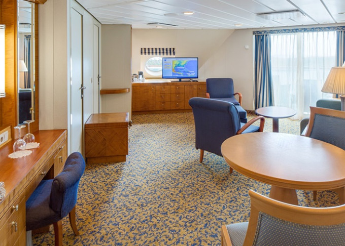 | RS - Royal Suite s balkonem 102 m² / balkon 10 m². Výhody Royal Suite Class. 10. paluba. Max 4 osoby. | 288 032 Kč 288 032 Kč za osobu | ||