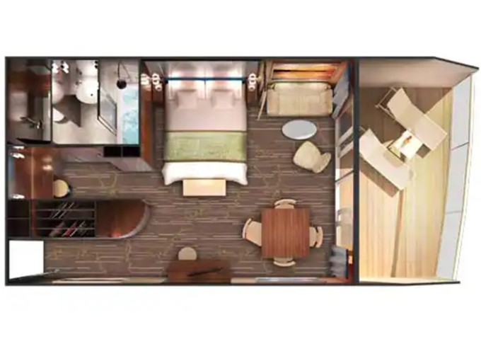 | MB - Club Suite s balkonem 26 m² / balkon 5 m². Výhody Club. 11. paluba - vpředu. Max 4 osoby. | 30 922 Kč 15 461 Kč za osobu | ||