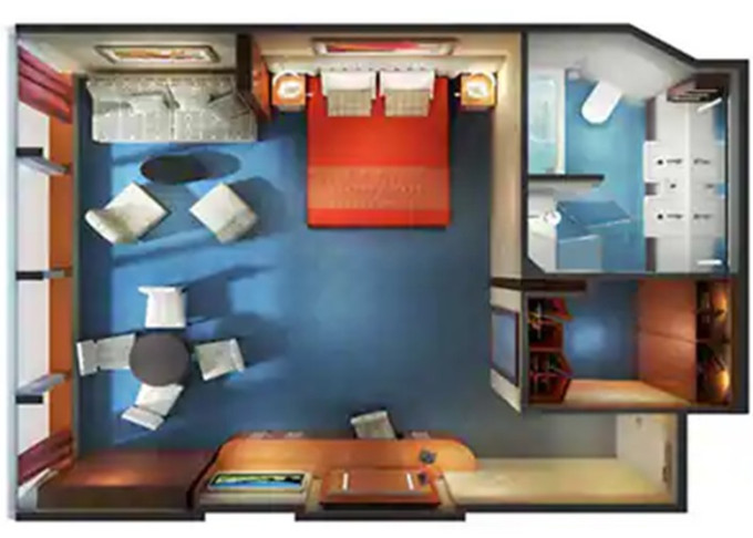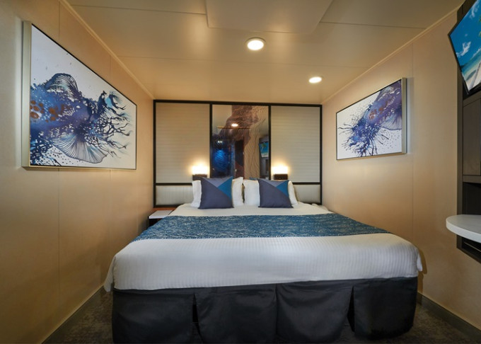 koupelna se sprchou a WC, 2 lůžka, v některých kajutách možnost přistýlek, toaletní stolek, úložné prostory, interaktivní TV, sejf, telefon, vysoušeč vlasů.