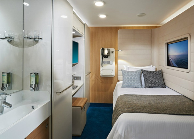 koupelna se sprchou a WC, 2 lůžka, v některých kajutách možnost přistýlek, toaletní stolek, úložné prostory, interaktivní TV, sejf, telefon, vysoušeč vlasů.