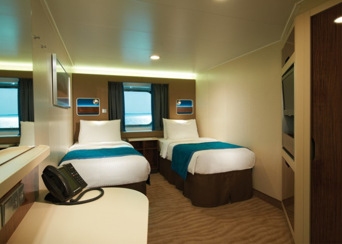 koupelna se sprchou a WC, 2 lůžka, v některých kajutách možnost přistýlek, toaletní stolek, úložné prostory, interaktivní TV, sejf, telefon, vysoušeč vlasů.