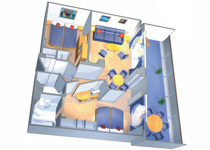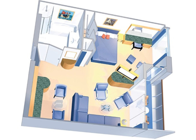| VP - Ocean View Panoramic Suite (bez balkonu) 38 m². Panoramatické neotevíratelné okna. Výhody Royal Suite Class. 12. paluba. Max 6 osob. | 182 998 Kč 45 749 Kč za osobu | ||