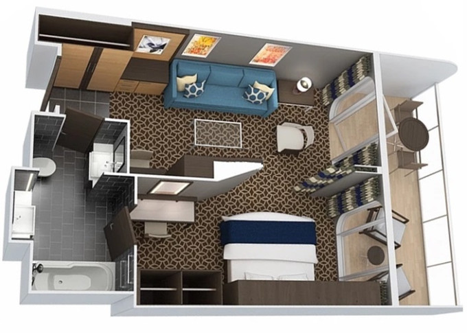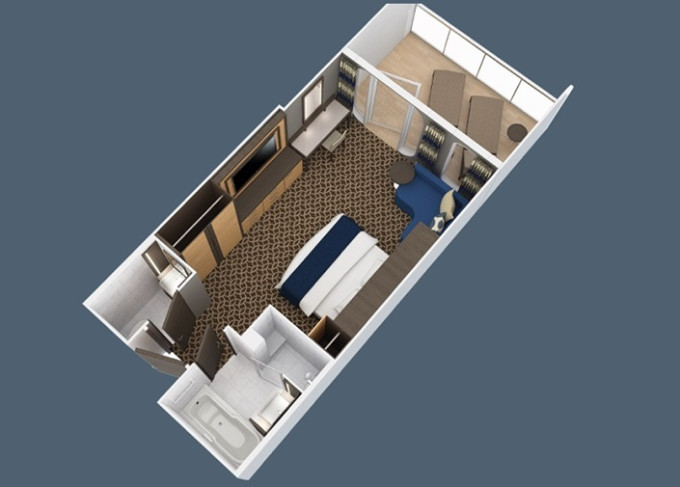 | 1U - Vnitřní kajuta s virtuálním balkonem 15 m². Obrazovka velkosti balkonových dverí s promítaným výhledem. 9/10. paluba. Max 2-4 osoby. | 66 227 Kč 16 557 Kč za osobu | ||