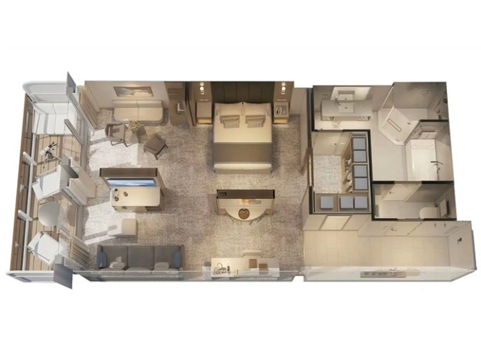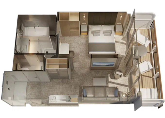 | CB - Cabana Minisuite 31 m² / 6 m² balkón a lounge. 10. paluba. Výhody Cabana. Výhody Mini-Suite. | 90 269 Kč 45 134 Kč za osobu |