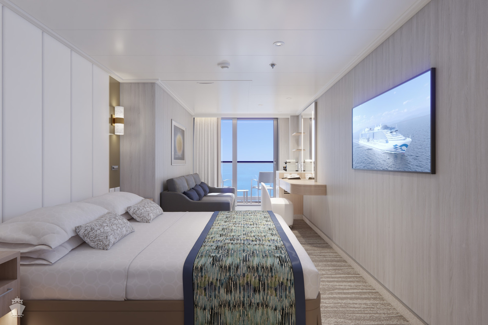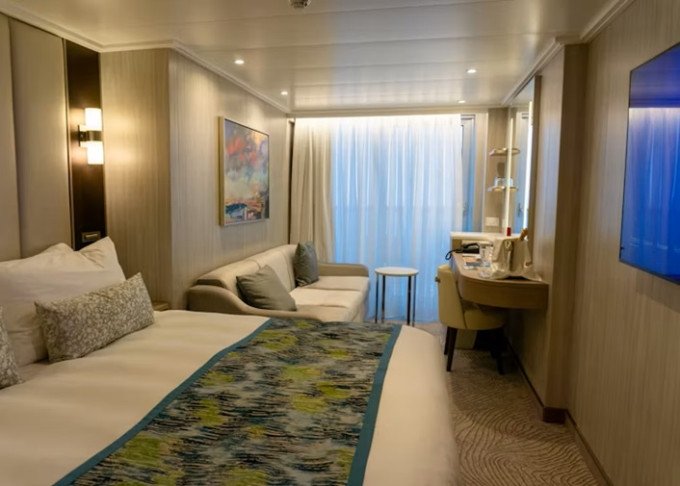 Standardní vybavení kajut: koupelna se sprchou a toaletou, 2 lůžka s možností konfigurace, úložné prostory, minibar, fén, TV, trezor. Balkony je vybaven malým stolkem a 2 židlemi či lehátky.