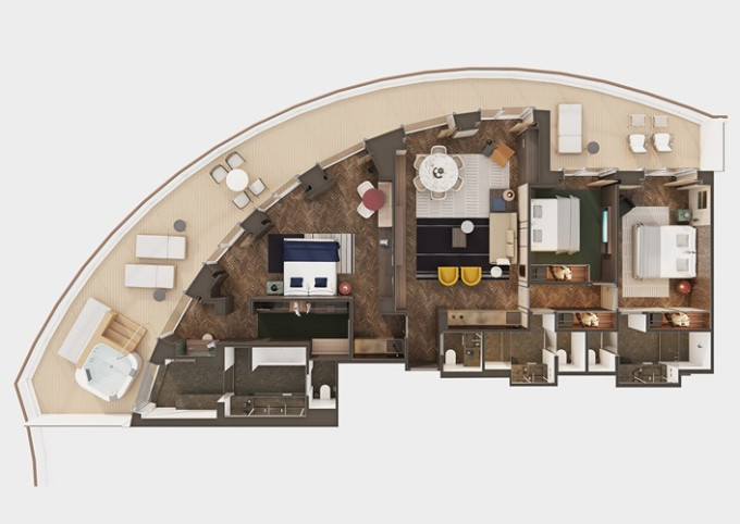 | H4 - Apatrmá he Haven Owner's Suite na zádi s velkým balkónem 41 - 43 m² / balkón 49 m². 10. - 12. paluba, Max 2-4 osoby. Výhody The Haven. | 265 261 Kč 132 631 Kč za osobu |