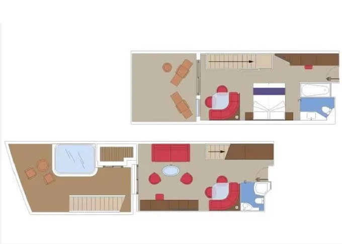 | YJD - Yacht Club Duplex Suite s vířivkou 46 m² + balkón 30 m². Vířivka. 2 podlaží, šatník, 2 koupelny (1 s vanou). Max 4 osoby. 16. paluba. Cenový model MSC Yacht Club. | 228 045 Kč 228 045 Kč za osobu | ||