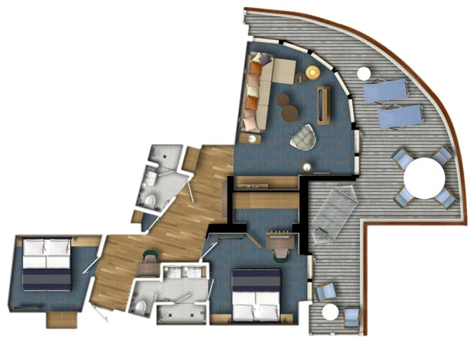 | SPNO - Panorama Suite 73-77 m² + balkon 31-36 m² se stolem, lehátky a houpací sítí. 2 ložnice a 2 koupelny. 6,9,10. paluba. Max 6 osoby. Výhody Suite. | 517 933 Kč 129 483 Kč za osobu | ||