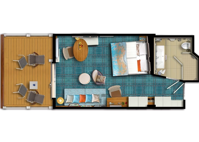 | BAGO - Kajuta s balkonem kat. G 17 m² + balkon s omezeným výhledem 5 m². 6. paluba. Max 4 osoby. | 422 320 Kč 211 160 Kč za osobu |