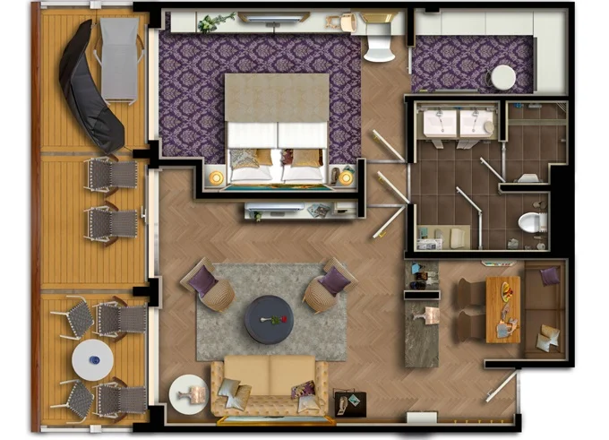 | SUTO - Themen Suite 54 m² + balkon 15 m² se stolem, lehátkom a houpací sítí. Ložnice, Obývací část, šatník. 10. paluba. Max 4 osoby. Výhody Suite. | 400 589 Kč 400 589 Kč za osobu | ||