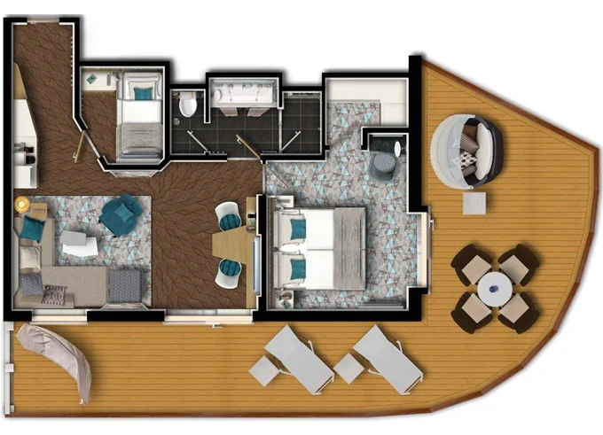 | SUTO - Themen Suite 54 m² + balkon 15 m² se stolem, lehátkom a houpací sítí. Ložnice, Obývací část, šatník. 10. paluba. Max 4 osoby. Výhody Suite. | 277 175 Kč 92 392 Kč za osobu | ||