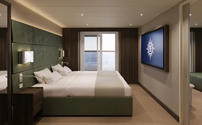 Suite s balkónem: cca 31 m², kajuta s manželskou postelí (na požádání 2 oddělené postele) a rozkládací pohovka. Klimatizace, koupelna s vanou a WC, toaletní stolek, prostorná skříň, interaktivní TV, telefon, minibar, sejf, vysoušeč vlasů. Balkon se stolkem a židlemi.